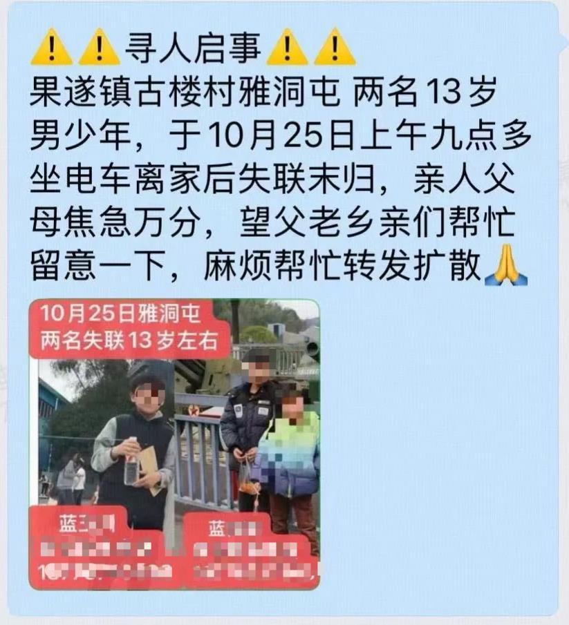 体育新闻记者邓博 10月25日,广西壮族自治区来边市新城县过水镇两名13岁男孩失踪,家人发出失踪通知书。记者27日获悉,救援队26日下午在当地一处灌溉渠中发现了两名儿童的尸体。该镇当地政府通报称,死亡符合溺水特征,排除任何刑事指控。据家人发布的失踪报告显示,威环市新城县郭水镇鼓楼村亚东屯的两名13岁男孩于上午9点左右乘坐电动车离家出走。 10月25日失踪。希望网友们能够提供线索。 10月27日,记者联系上村民。参与救援的鼓楼村、亚东村。他告诉记者,两个孩子今年13岁。失去联系后,村民们积极帮忙寻找。据了解,这两个男孩最初去钓鱼,并将他们的电动汽车停在当地灌溉渠项目的一座桥上。被发现时,他们的手机和钓鱼竿仍在电动车内。据上述村民介绍,当地居民25日晚在电瓶车停放处附近的灌溉渠中进行了搜寻,但没有发现男孩的踪迹。 26日下午,南宁救援队在这条灌溉渠中发现了两名儿童的尸体。 “家人非常悲伤,葬礼将于今天(27日)举行。”汽车城当局报告了这一情况。据忻城县果绥市人民政府此前发布的情况报告显示,10月25日上午9点44分,2025年,我市两名青少年离家出走,再也无法联系。经公安机关侦查,经应急、消防、水利、卫生部门、当地领导和群众大规模搜寻,下午4时左右,在郭水市龙马村北龙屯附近的灌渠中发现两具无生命迹象的尸体。 10月26日,亲属证实他们就是失踪的青少年。法医现场勘验符合溺水特征,该案作为刑事案件予以驳回。进一步的相关工作仍在进行中。